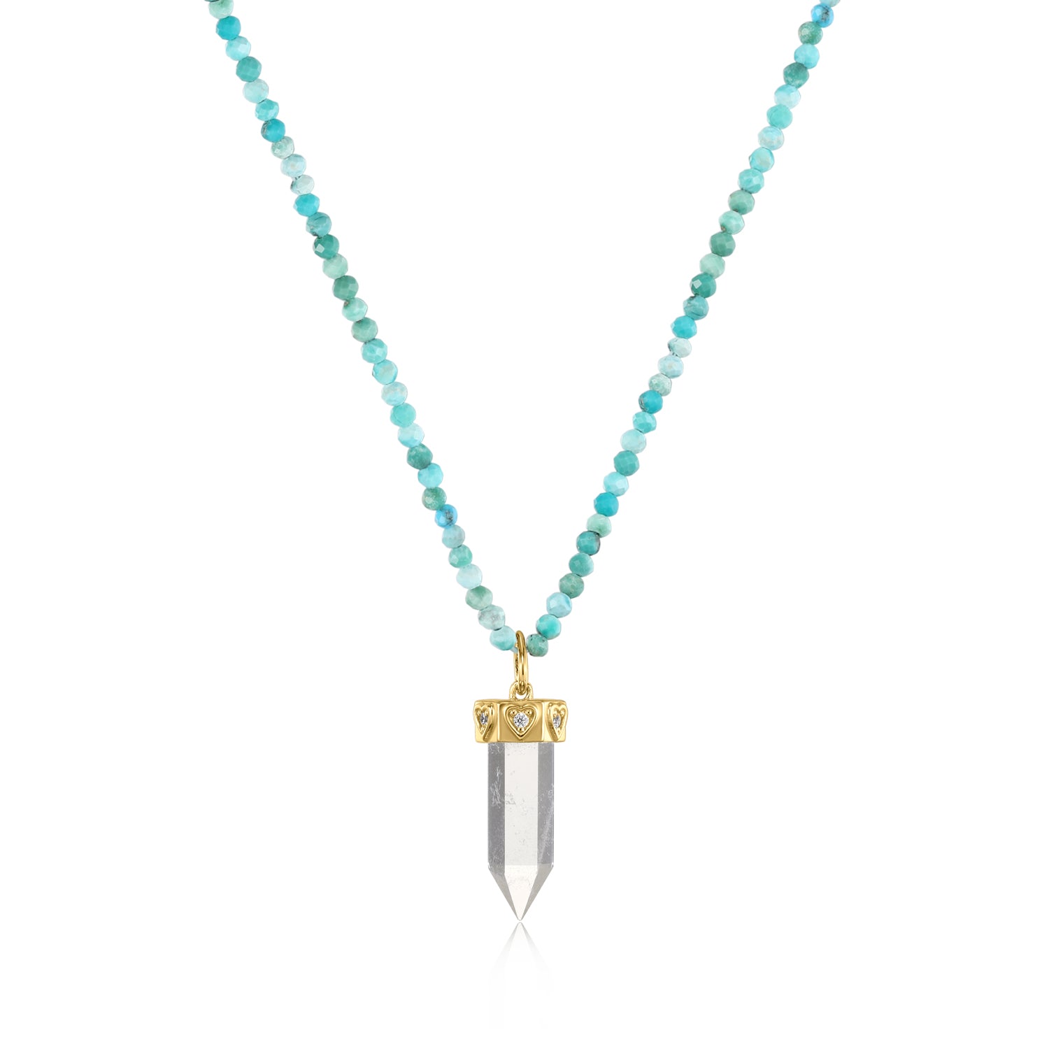 Set in brass plated with 18K gold and finished with a protective eco-coating, the pendant’s golden crown is adorned with three white cubic zirconia stones, adding a refined sparkle that complements the gemstone’s natural clarity.