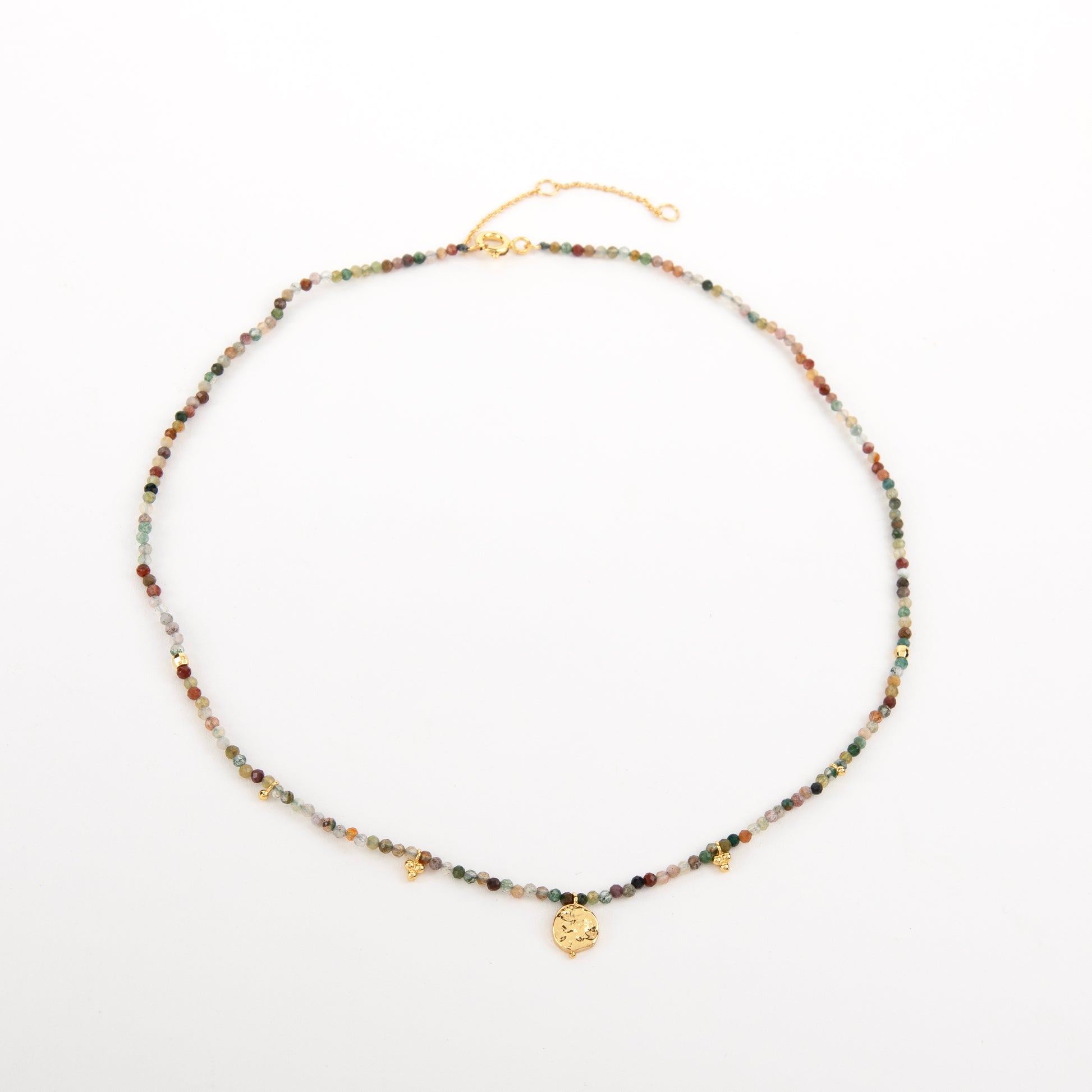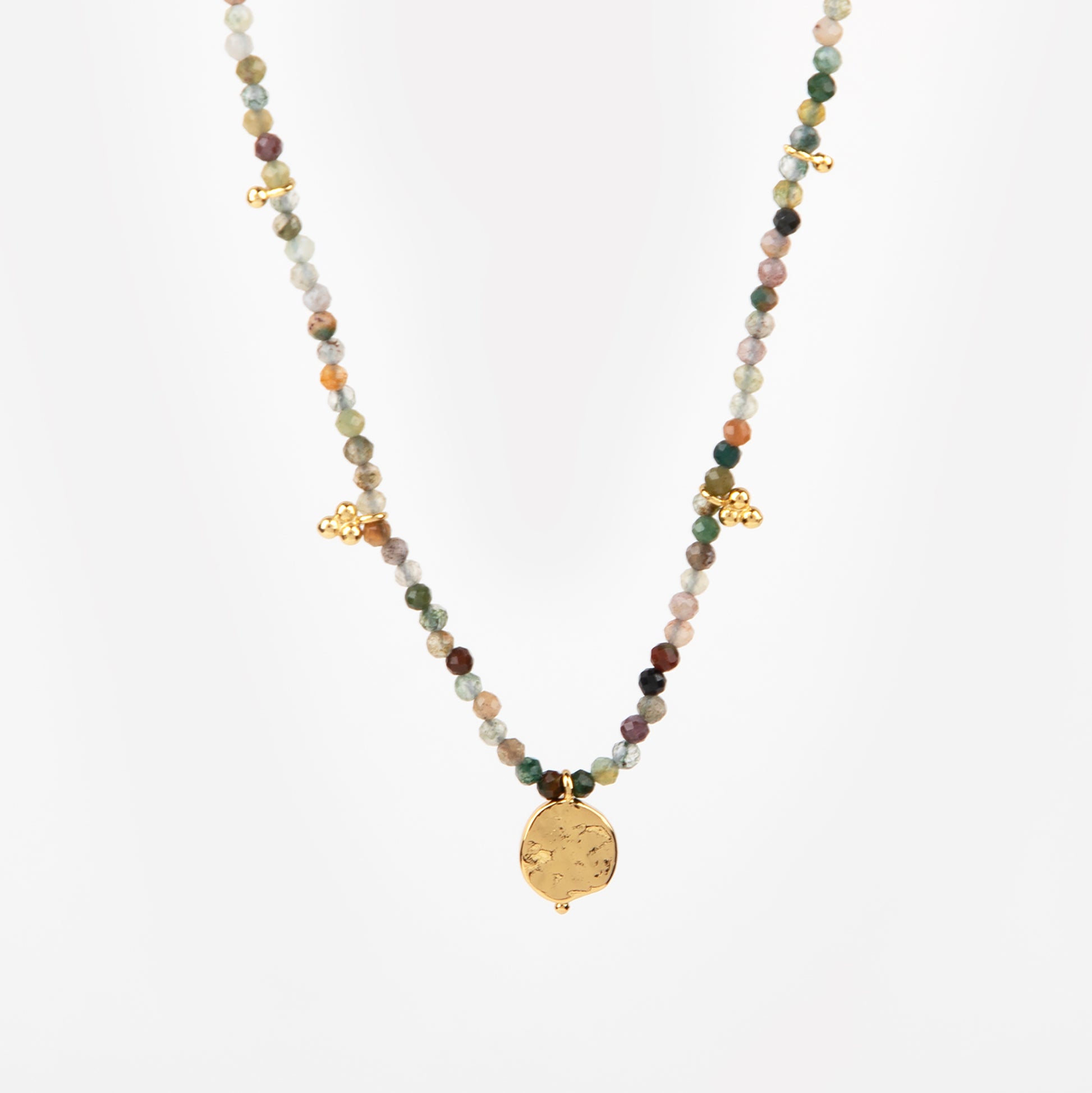 Gentle and grounded, the Morning Glory Agate Charm Necklace captures the quiet elegance of dawn. Hand-strung with India Agate in soothing multi-tonal hues, each bead reflects the calm rhythm of nature — moss greens, soft greys, and warm earth tones blending like morning mist.
