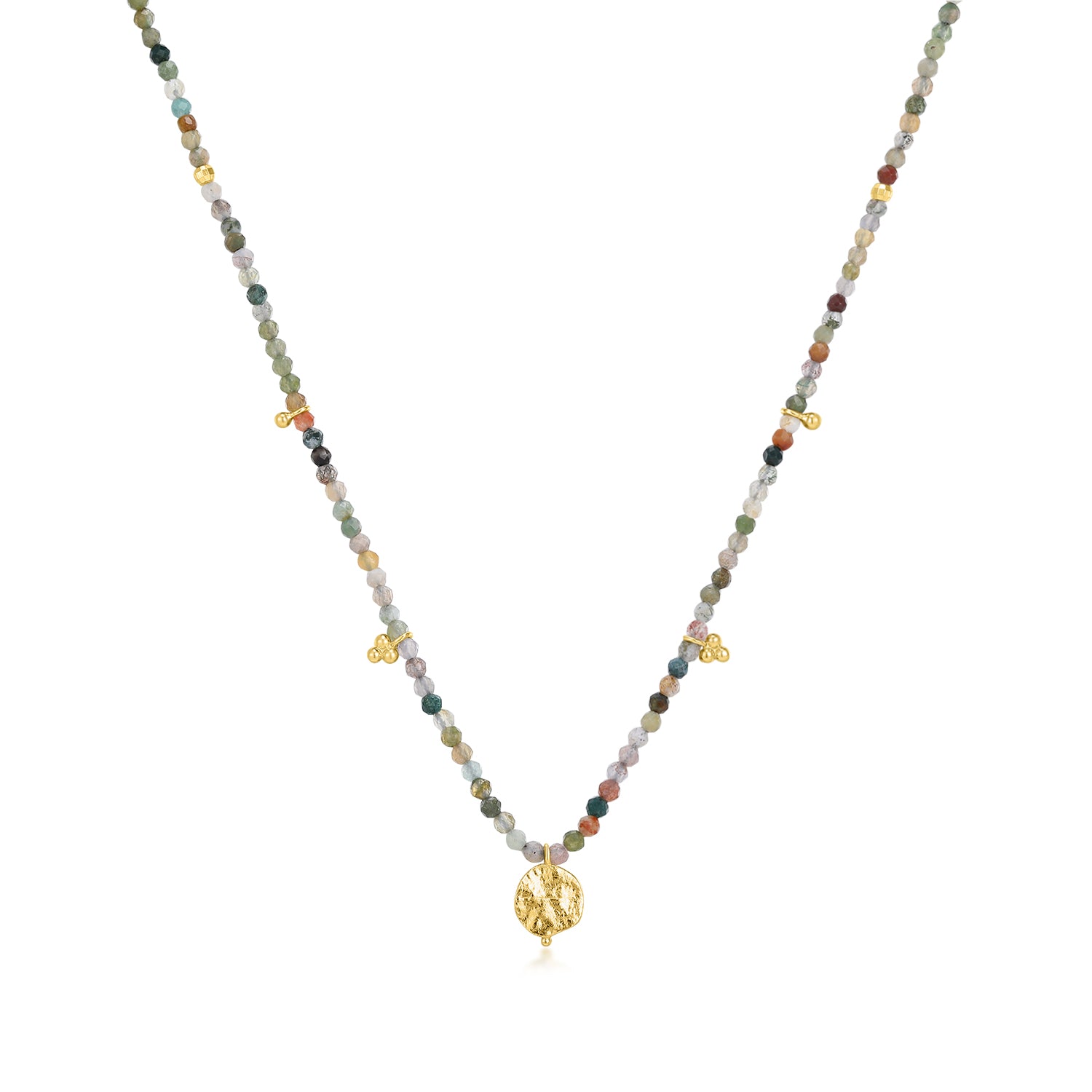At its center rests a textured gold disc charm, reminiscent of the morning sun, adding a subtle focal point that radiates warmth and balance. Crafted from brass, plated with 18K gold, and finished with an eco-friendly coating for lasting brilliance, this necklace brings together natural energy and refined craftsmanship.